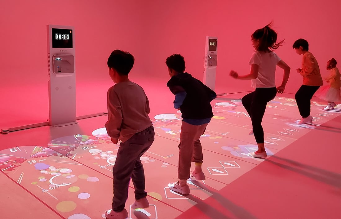 床に投影された映像を見ながら、直感的に楽しみながら運動ができる室内トレーニングマシン。フィットネスや脳トレ、ヘルスゲームなどお子さんから高齢者まで楽しめます。
