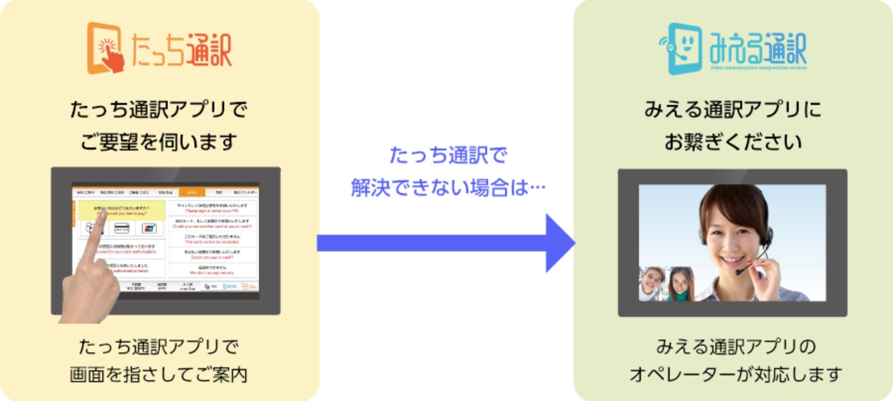 より詳細なご案内の際には、ワンタッチでみえる通訳アプリに切替え、そのまま通訳オペレータにお繋ぎください。