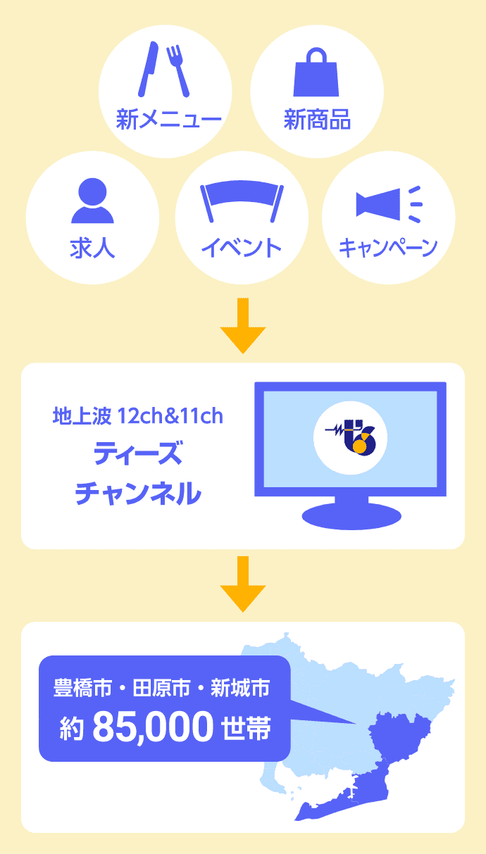 地域情報満載のコミュニティチャンネル「ティーズチャンネル」(地上波12ch&11ch)内でテレビCMを放送します。豊橋市・田原市・新城市の85,000世帯を超える利用者へPRすることができます。