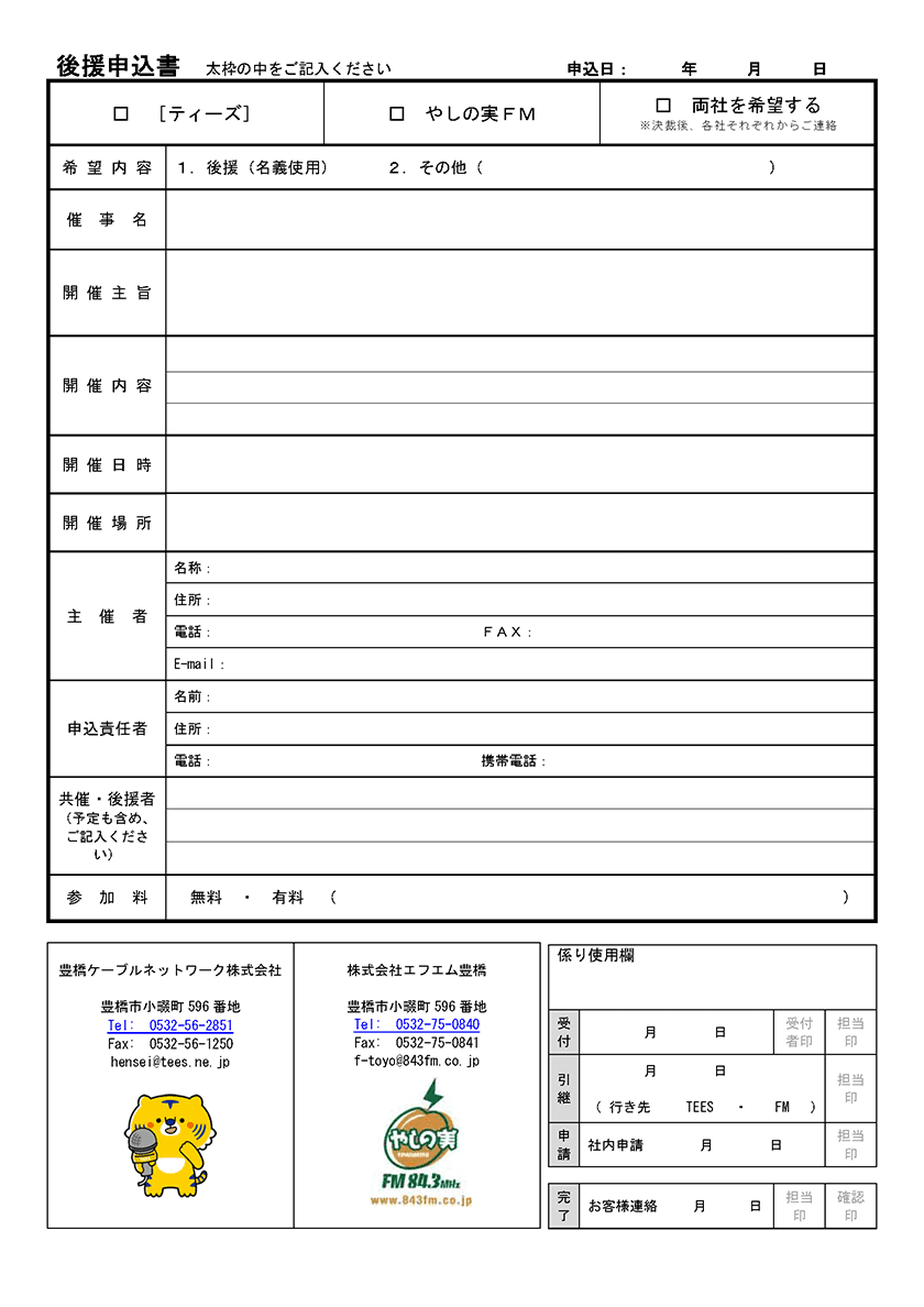 ティーズに応援して欲しいイベントなどの後援依頼は、WEBフォーム、FAX、郵送でお申し込みください。ティーズに直接ご持参いただいての受付も可能です。