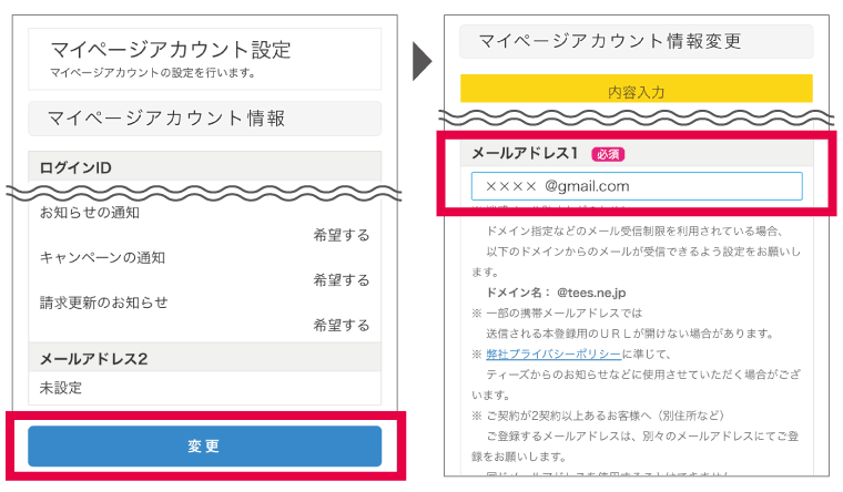 マイページアカウント設定の画面が表示されたら、「変更」ボタンを押して、「メールアドレス1」の欄に新しくメールアドレスを入力してください。