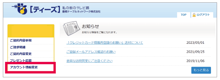 マイページ画面左側に表示されているメニューから、アカウント情報変更を選択してください。