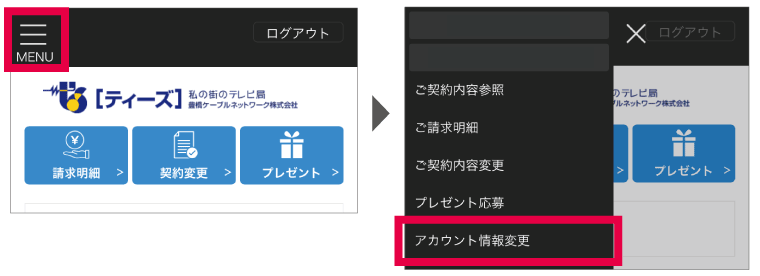 マイページ画面左側に表示されているメニューから、アカウント情報変更を選択してください。