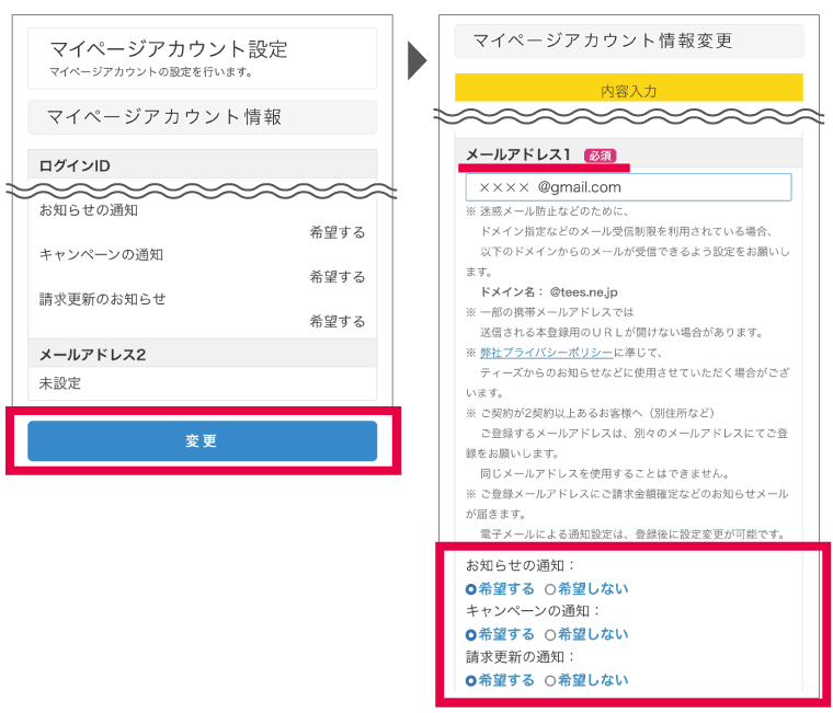 マイページアカウント設定の画面が表示されたら、「変更」ボタンを押してください。