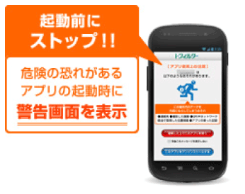 アプリ警告機能は、アプリ本来の使用目的とは関係ないデータにアクセスしようとするなど、危険の恐れがあるアプリの起動時に警告画面を表示するので、アプリにひそむリスクを確認することができます。