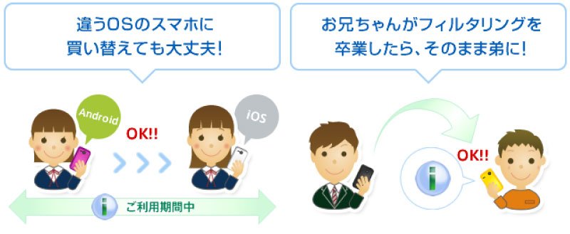 ご購入いただいたシリアルIDで、iOS、Android端末用のそれぞれの「i-フィルター」をそのままご利用いただけます。