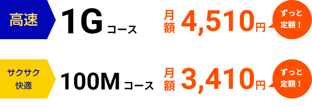 高速1Gから、お手軽100Mまでご利用状況に合わせてコースをお選びいただけます。コース変更も月単位で可能です。
