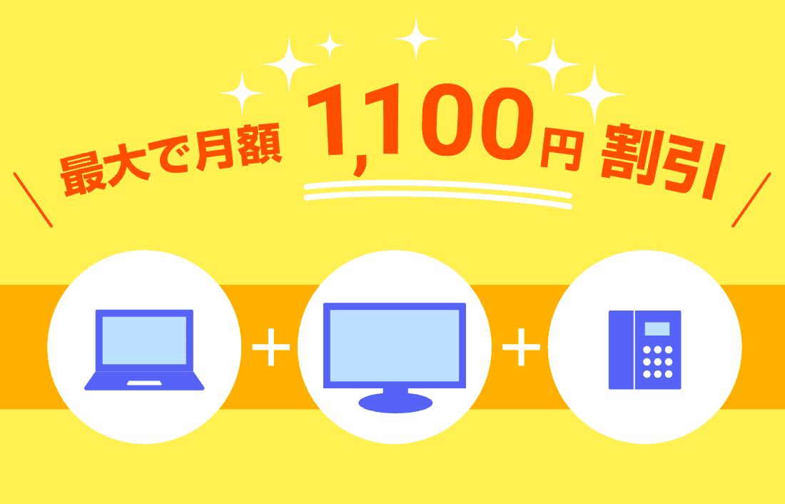 インターネットにテレビや電話を組み合わせると最大1,100円割引でおトク。携帯会社との提携割引サービスもあり、トータルでさらにおトクになります!