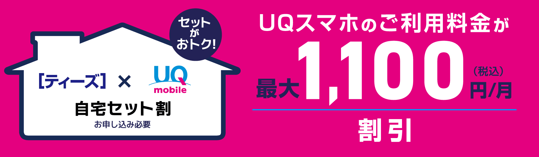 - 自宅セット割には「でんきコース」もございます。でんきコースの詳細についても、店頭スタッフまたはUQホームページでご確認ください。